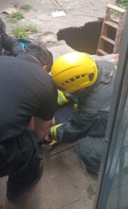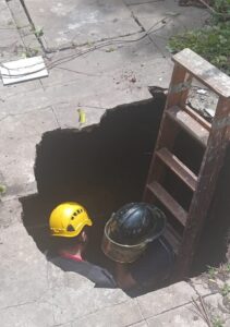 🔹Primariamente, pudieron estabilizarlo mediante la utilización de un chaleco de extricación y collarín. Posteriormente, procedieron a deslizarlo por una escalera tras utilizar una reducción de fuerza a través de un sistema de cuerdas y poleas hasta lograr liberarlo del pozo.