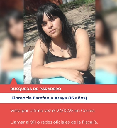 Se solicita la colaboración de la población para dar con el paradero de Florencia Estefania Araya de 16 años quien falta de su hogar desde a las 18hs en la localidad de Correa. Viste remera azul, pantalón de Jean gris oscuro, zapatillas blancas y negras. Es de tes trigueña, mide 1,80mts aprox., tiene pelo castaño largo y presenta cicatriz en muñeca derecha.