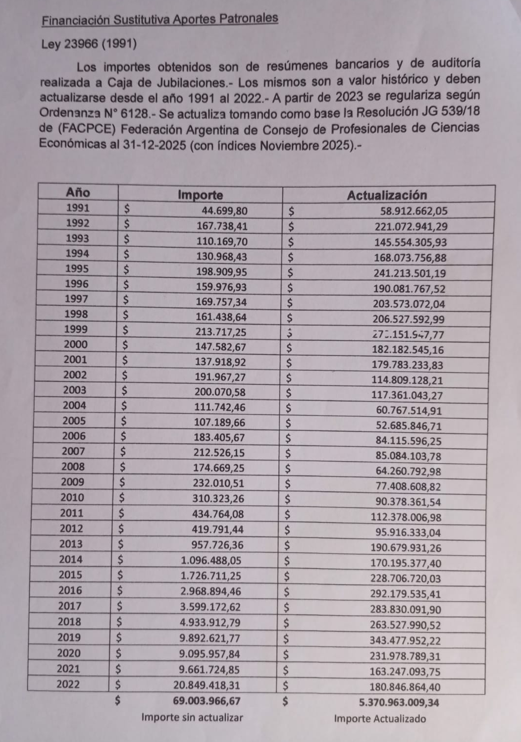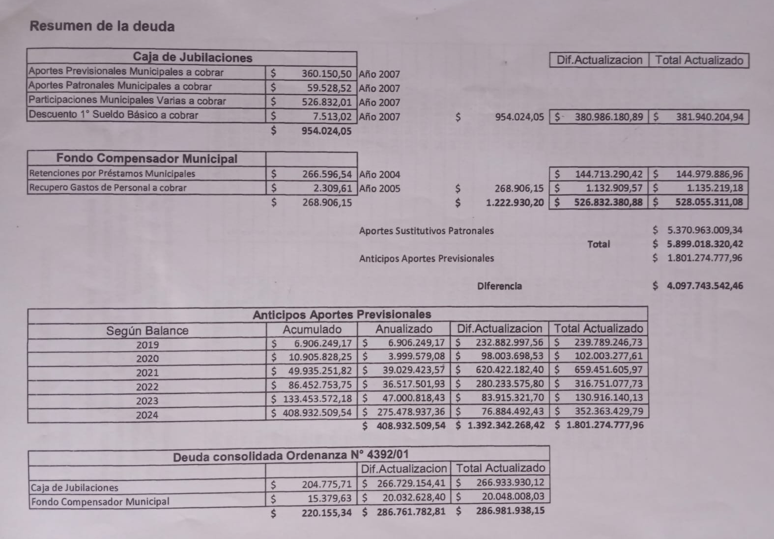 Actualizados según los índices publicados por el BANCO DE LA NACIÒN ARGENTINA y haciendo gala por ser experto, nuevamente el Jubilado Delky Silvano `tras un trabajo arduo y certero actualizó las cifras históricas desde el año 1991 al año 2022. Es decir, más de 32 años llegando a la friolera cifra de que el Municipio y sus autoridades quedaron excluyendo a la Caja de Jubilaciones de la cual asciende a $ 4.097.743.542,08 habiéndose quitado los $ 1.801.274.777,96 que el municipio adelantó para completar la nómina mensual de haberes jubilatorios.
