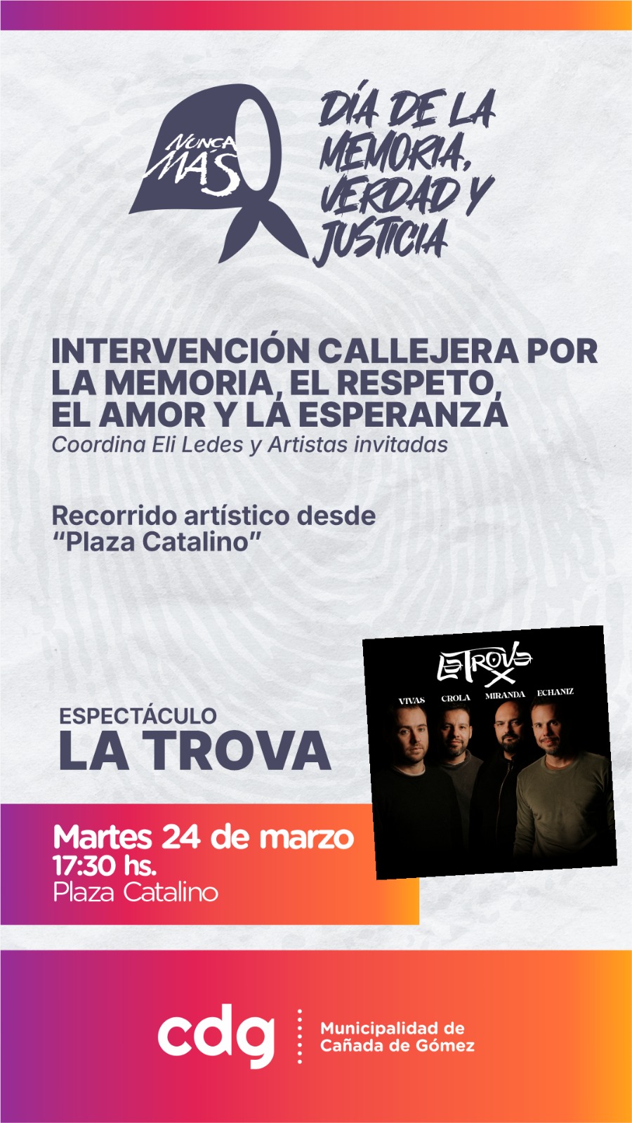En el marco del Día Nacional de la Memoria, por la Verdad y la Justicia, la Municipalidad de Cañada de Gómez invita a la comunidad a participar de una jornada especial de reflexión, arte y encuentro colectivo.