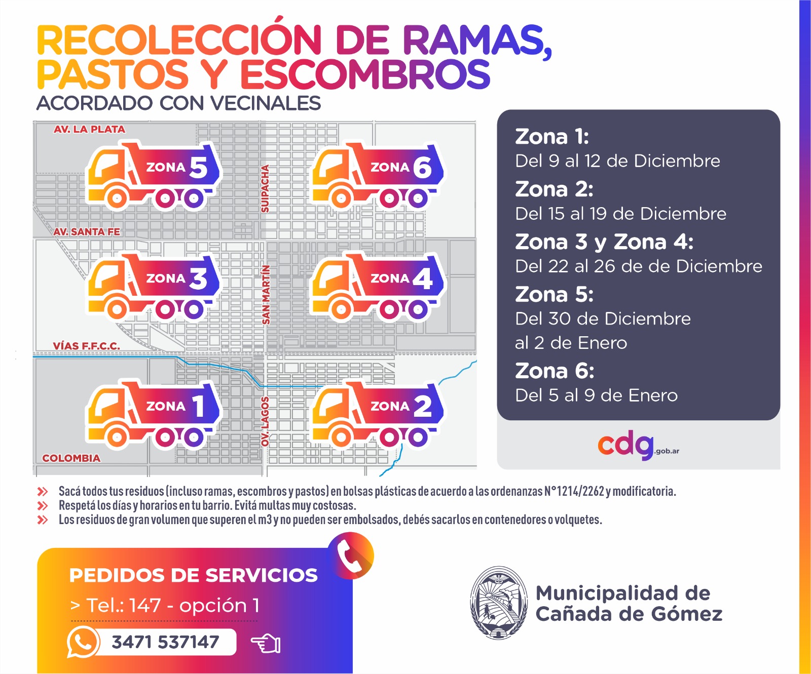 La Municipalidad de Cañada de Gómez informa el cronograma de recolección de ramas, pastos y escombros para las próximas semanas: