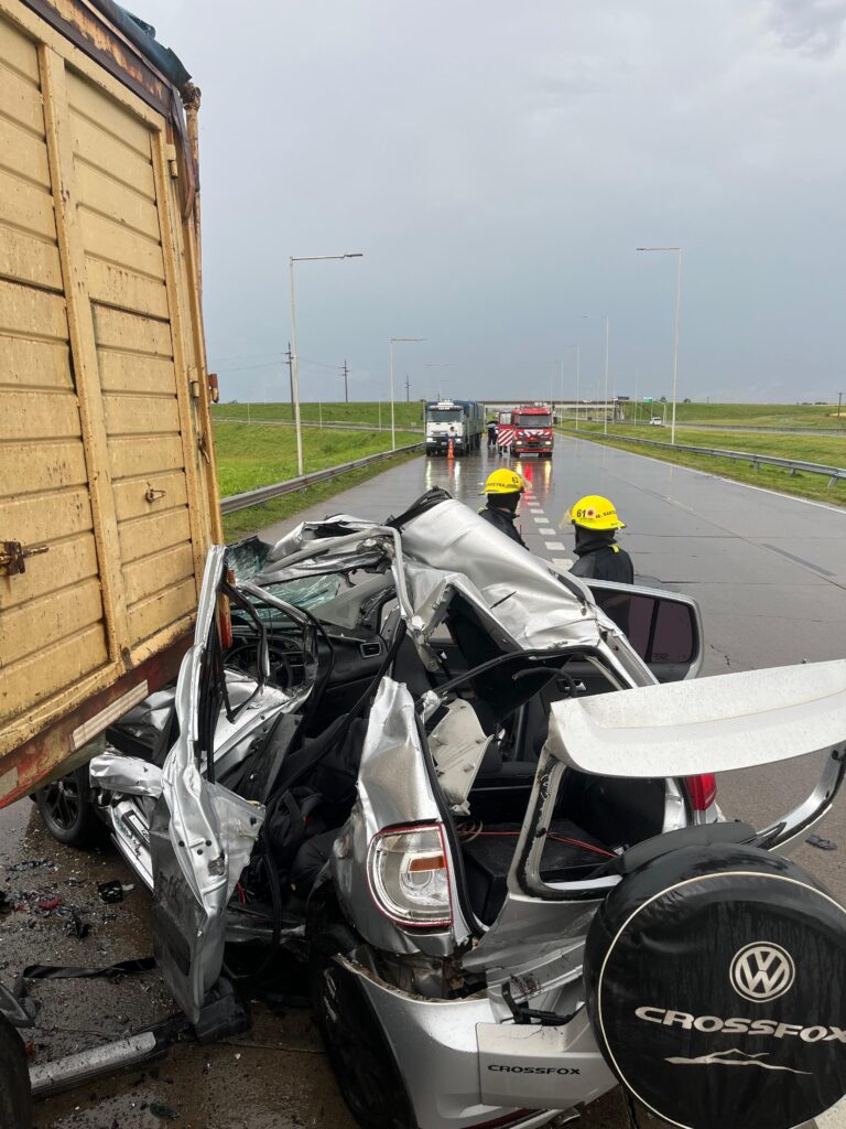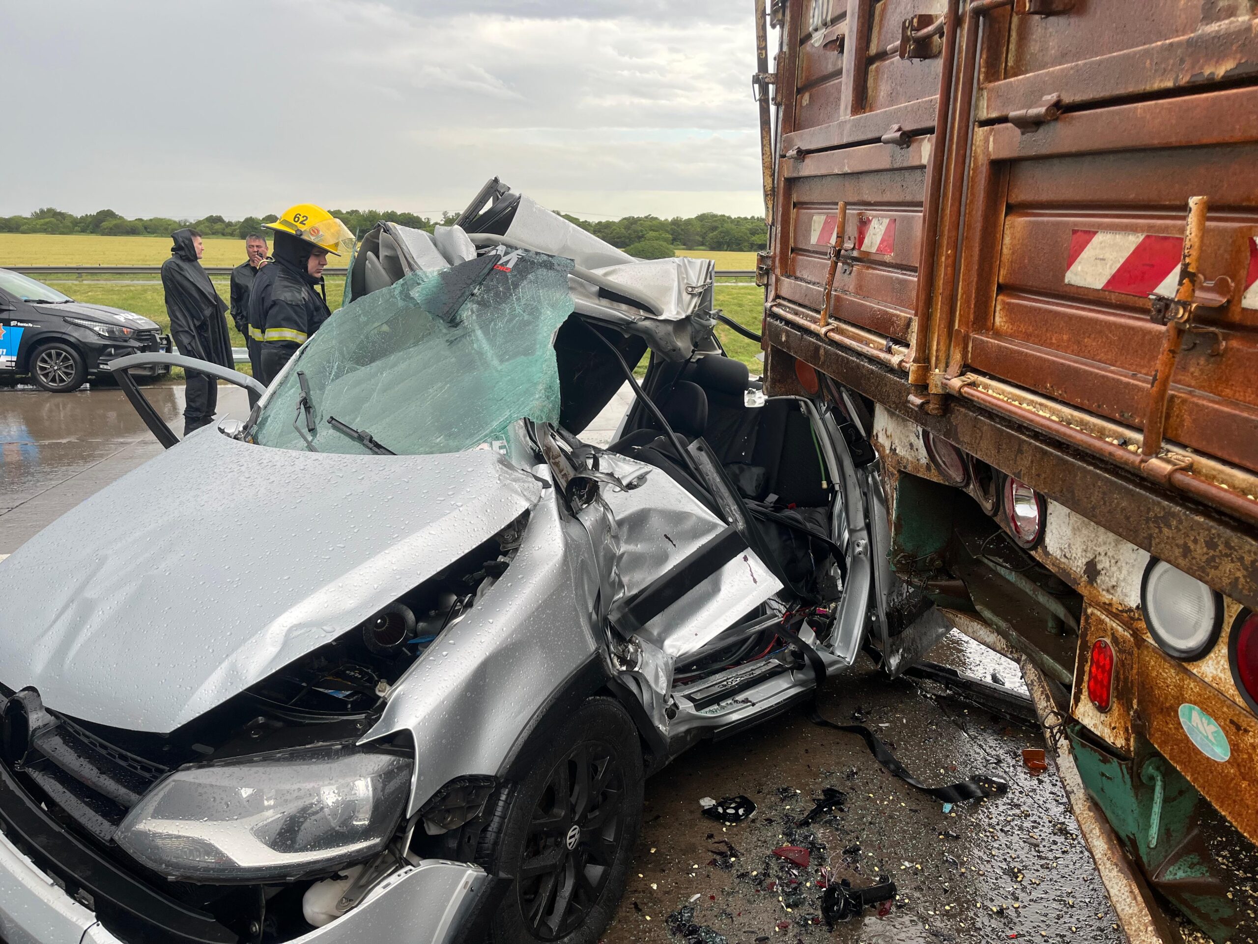 El primero de los siniestros se registró alrededor de las 08:00 horas, a la altura del kilómetro 357, en el acceso a la Ruta 91. En el lugar, un Volkswagen Fox, en el que viajaban tres jóvenes oriundos de Córdoba —que aparentemente regresaban del partido disputado por Belgrano, colisionó violentamente contra un camión estacionado sobre el acceso para incorporarse a la autopista.