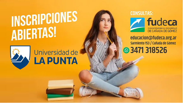 La Fundación para el Desarrollo anuncia que hasta el 15 de diciembre siguen abiertas las inscripciones para estudiar carreras virtuales de la Universidad de la Punta, ciclo lectivo 2026.