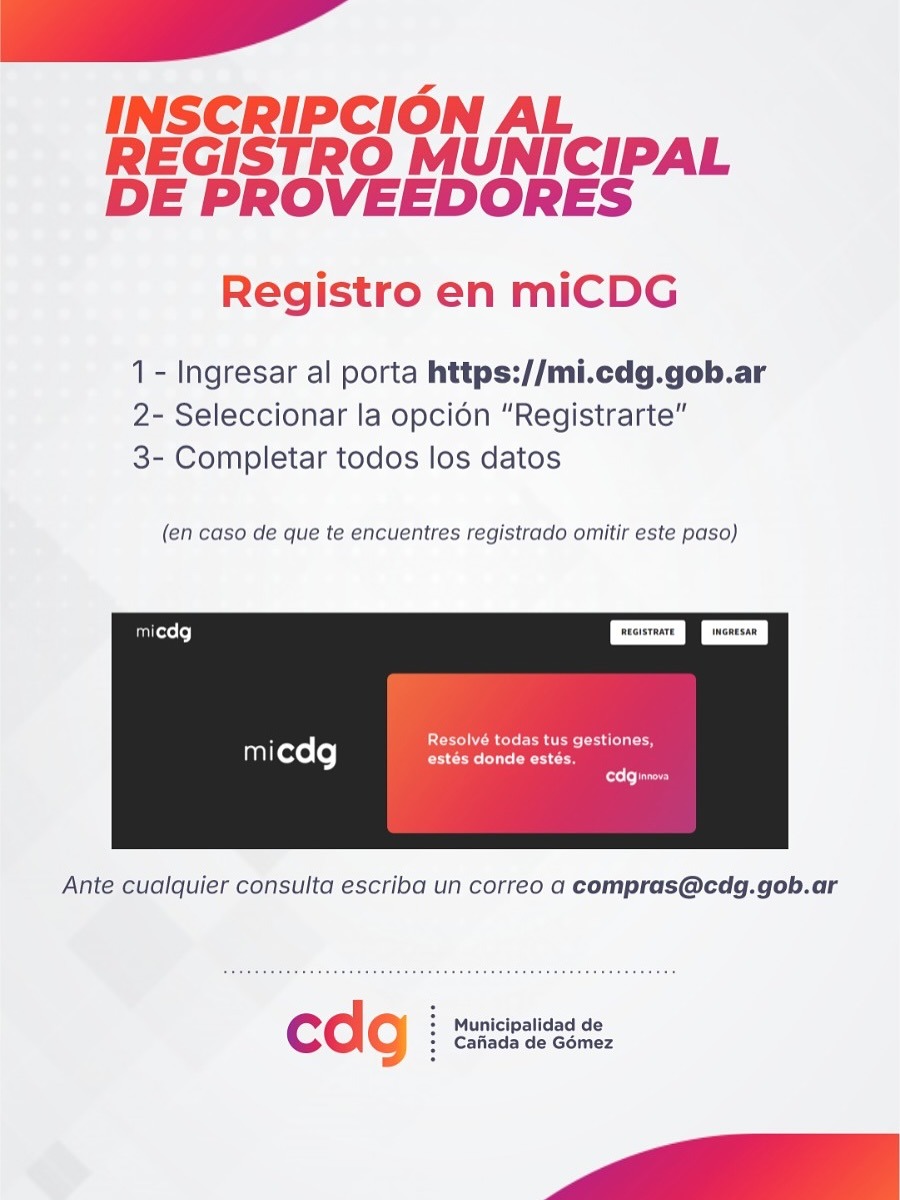 La Municipalidad de Cañada de Gómez informa que se encuentra abierta la inscripción al Registro de Proveedores del Estado, una herramienta que permite transparentar y agilizar los procesos administrativos de contratación pública.