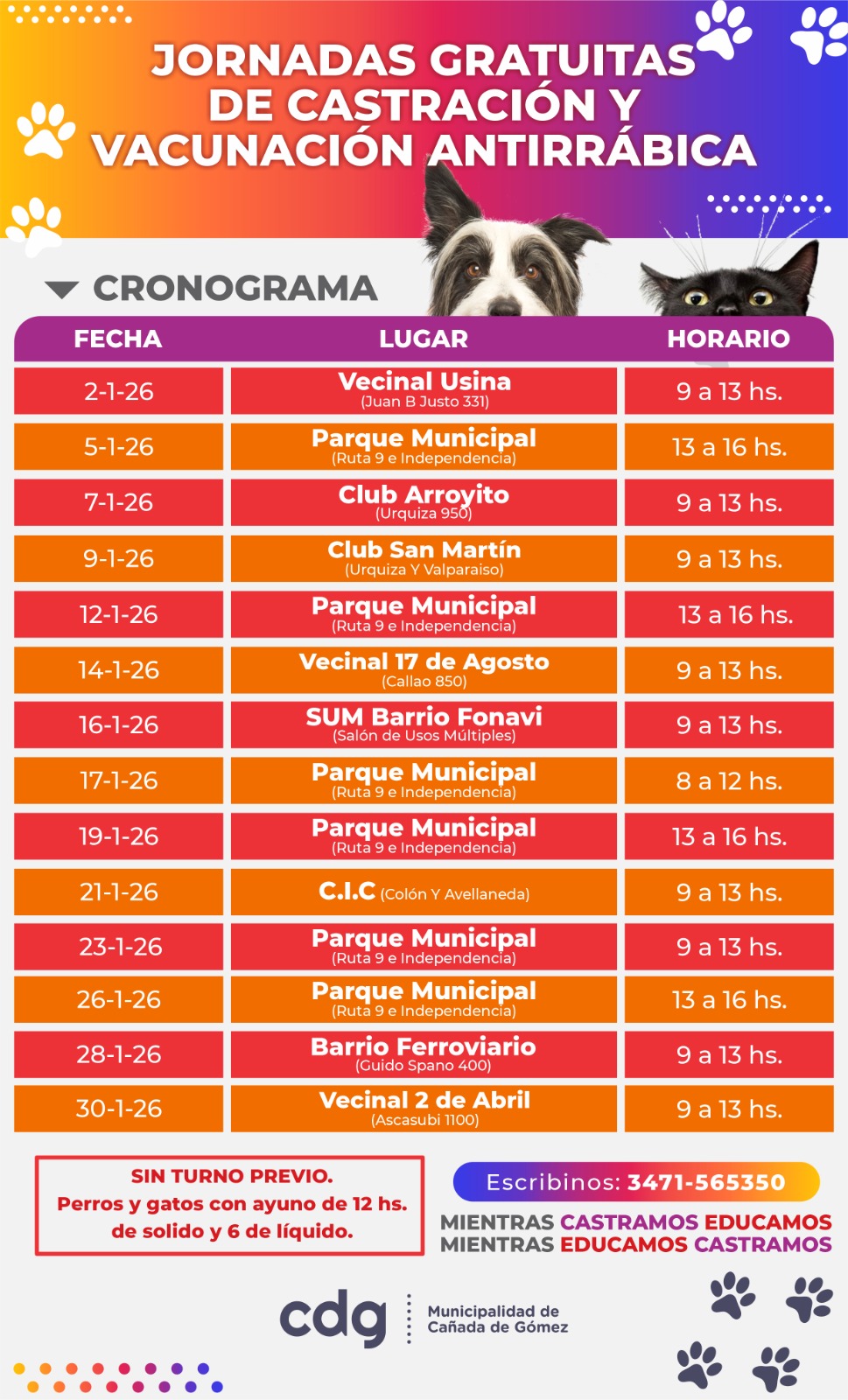 La Municipalidad de Cañada de Gómez informa el cronograma de castraciones, vacunación antirrábica y atención veterinaria primaria para el mes de enero, como parte del Programa de Equilibrio Poblacional que lleva adelante el Área de Salud Animal: