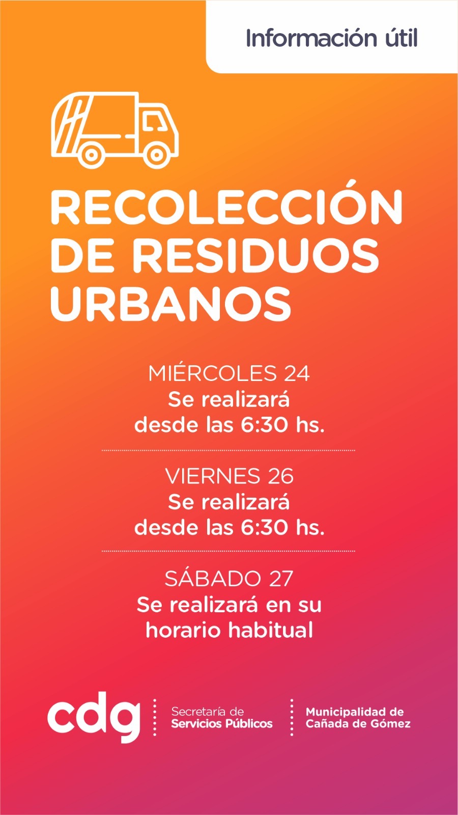 La Municipalidad de Cañada de Gómez, a través de la Secretaría de Servicios Públicos, informa a los vecinos el cronograma de recolección de residuos previsto para los próximos días, con motivo de Nochebuena y Navidad.