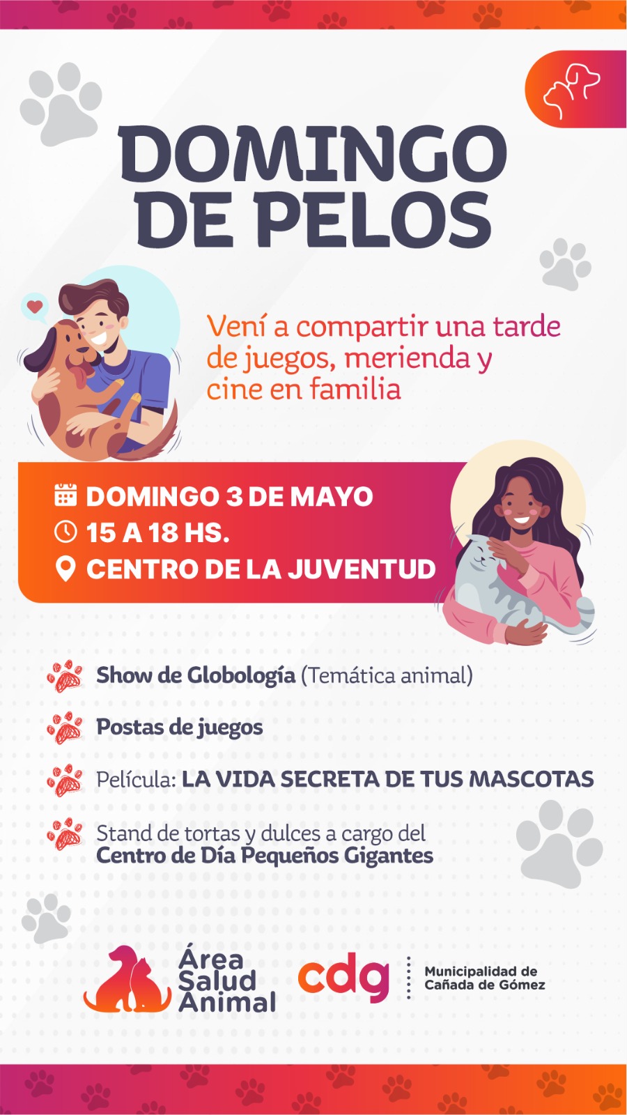 La Municipalidad de Cañada de Gómez, a través del Área de Salud Animal, invita a toda la comunidad a participar de una nueva propuesta recreativa y familiar: “Domingo de Pelos”, una jornada pensada para compartir junto a las mascotas en un ambiente de juegos, entretenimiento y concientización.
