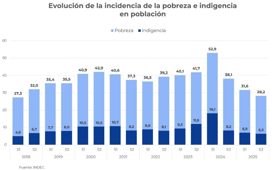 El Ministerio de Capital Humano informa que la pobreza en la Argentina continúa descendiendo y se ubicó durante el segundo semestre de 2025 en 28,2%, de acuerdo a la medición publicada este martes por el INDEC, una baja interanual de 9,9 puntos porcentuales respecto del segundo semestre de 2024.