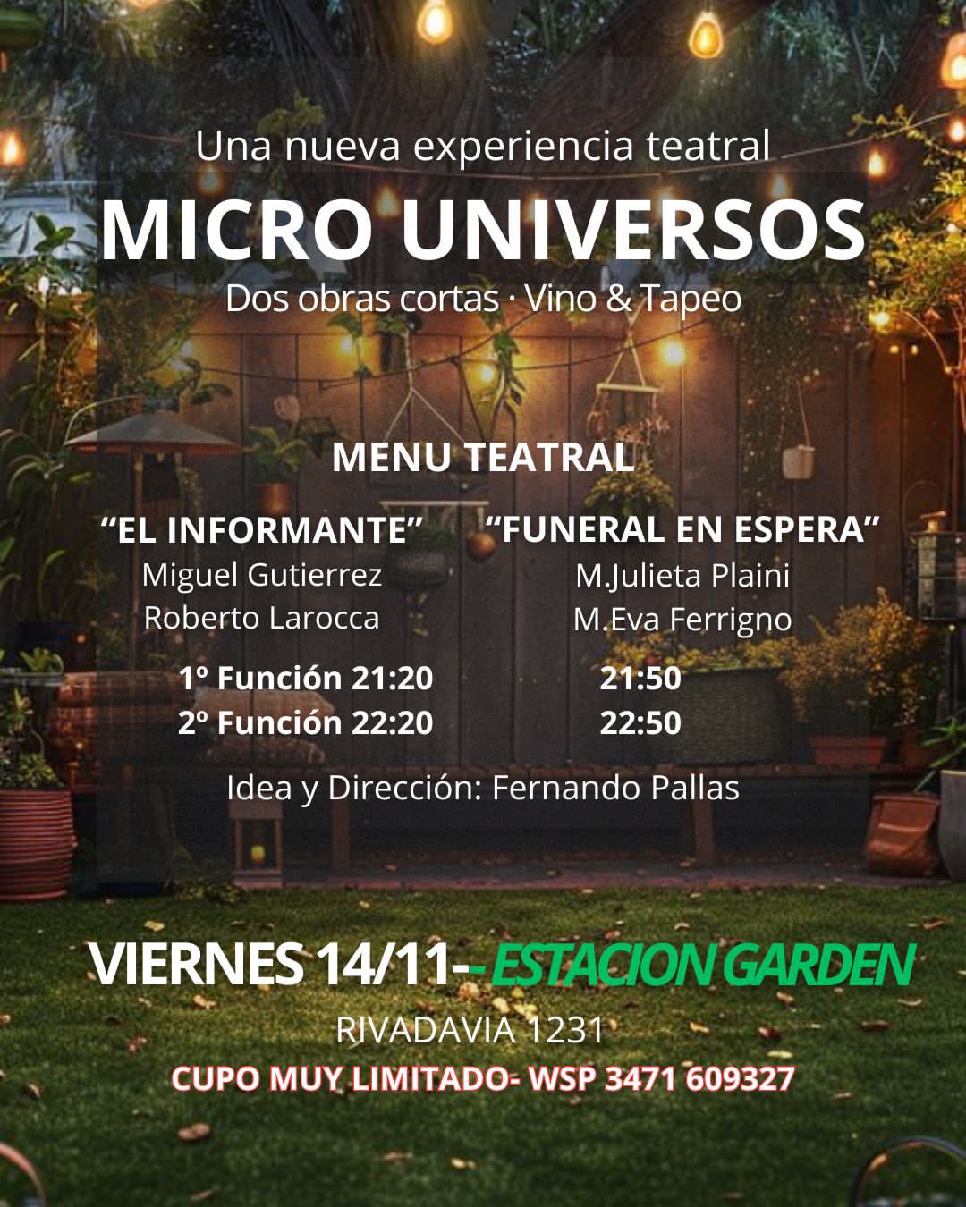 El viernes 14 de noviembre en Estación Garden (Rivadavia 1231), se presenta por primera vez Micro Universos, un ciclo creado para quienes buscan experiencias culturales distintas, íntimas y cercanas. Esta propuesta inaugura un nuevo formato teatral en la ciudad: dos obras breves, potentes y en espacios reducidos, donde el público vive la escena a centímetros de los actores.