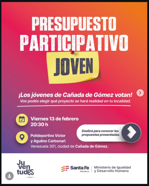 La Municipalidad de Cañada de Gómez invita a participar de una nueva instancia del Presupuesto Participativo Joven, una herramienta que promueve la participación activa y el compromiso de las juventudes.