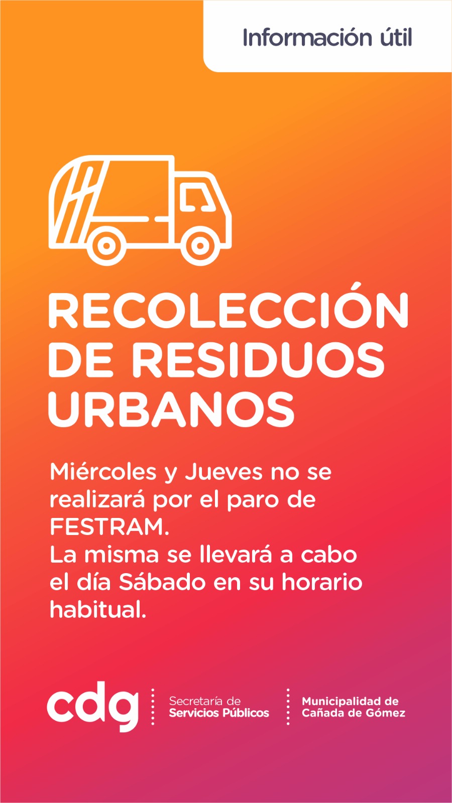 La Municipalidad de Cañada de Gómez informa a la comunidad que debido al paro dispuesto por FESTRAM, los días miércoles 11 y jueves 12 de marzo no habrá recolección de residuos por lo que se solicita a los vecinos no sacar los residuos en esas jornadas para colaborar con el orden y la limpieza de la ciudad.