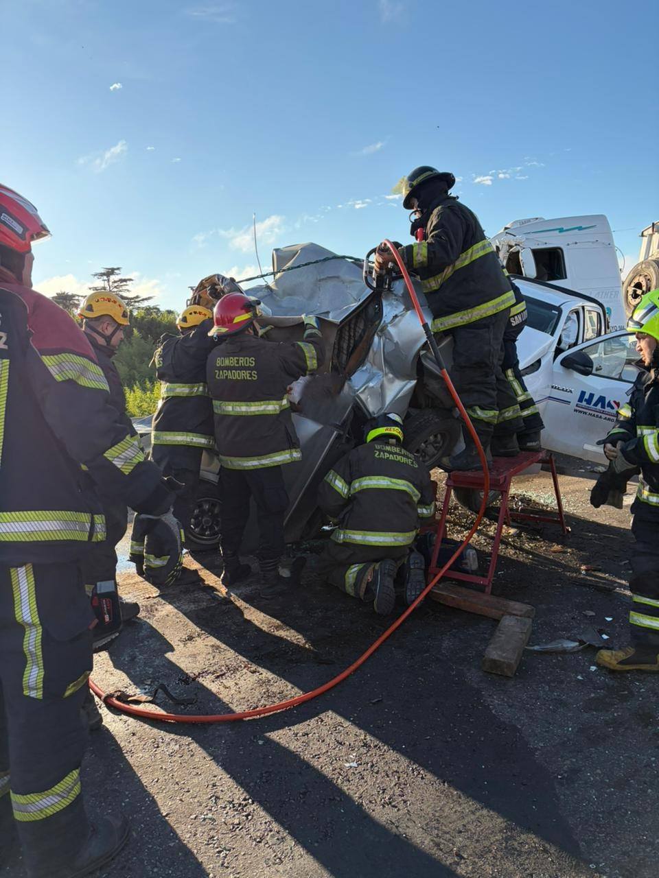 Al arribar al lugar, los efectivos constataron una colisión múltiple que involucró a tres camiones y una camioneta. El escenario presentaba una situación de extrema gravedad, con uno de los conductores atrapado en la cabina de su vehículo.