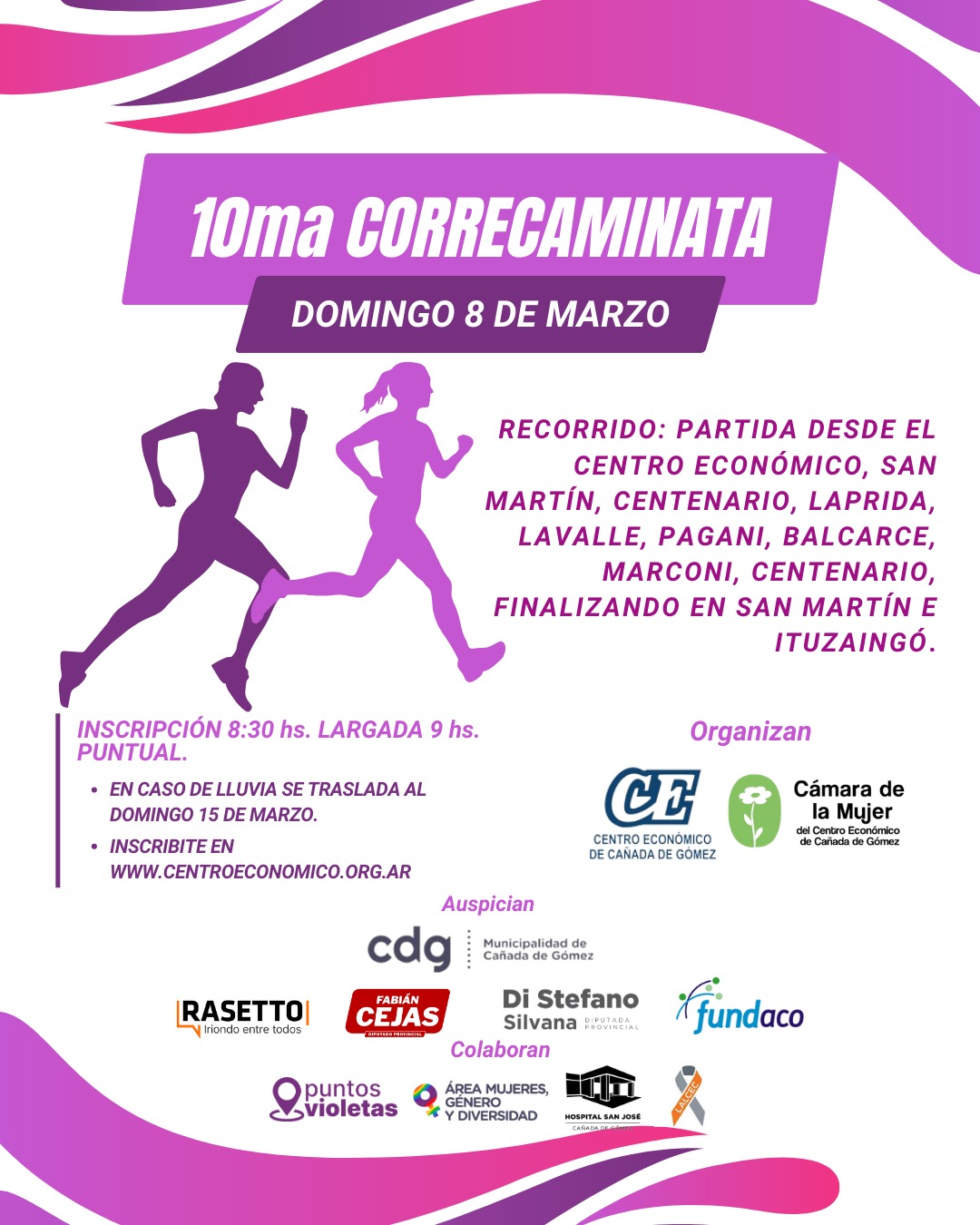 La CorreCaminata 2026 se llevará a cabo el domingo 8 de marzo con inscripción a las 8.30, entrada en calor y largada puntual a las 9hs. El recorrido tendrá largada y llegada desde el Centro Empresarial del Centro Económico, San Martín e Ituzaingó. El recorrido será: calle San Martín, Centenario, Laprida, Lavalle, Pagani, Balcarce, Marconi, Centenario y San Martín.