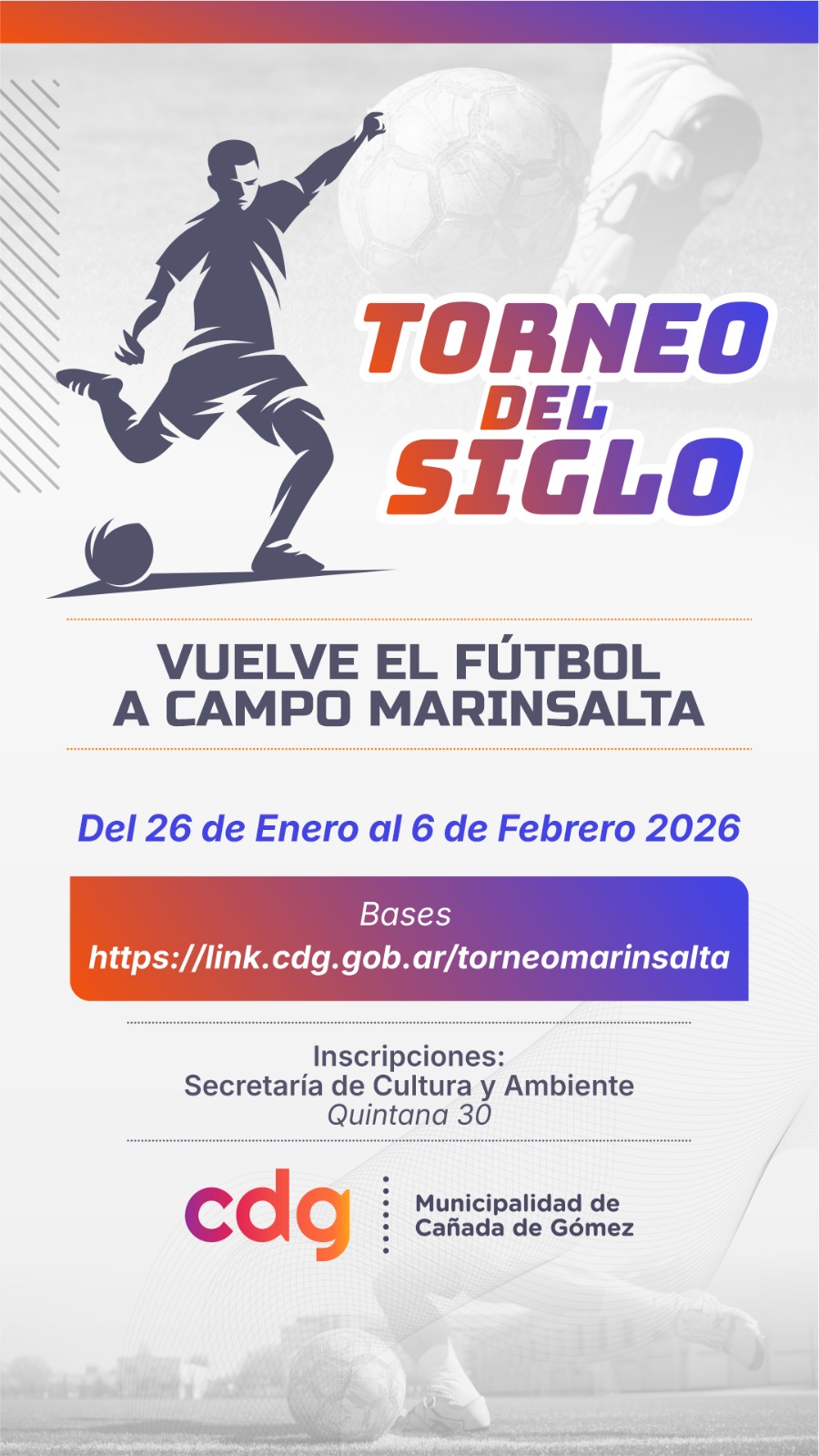 La Municipalidad de Cañada de Gómez informa que del 26 de enero al 6 de febrero de 2026 se desarrollará el Torneo del Siglo, marcando el regreso del fútbol a Campo Marinsalta, un espacio emblemático para fútbol de verano.